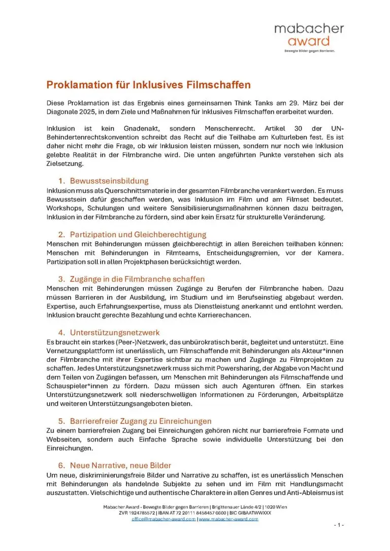 Unsere Proklamation ist das Ergebnis eines gemeinsamen Think Tanks am 29. März bei der Diagonale 2025, in dem Ziele und Maßnahmen für Inklusives Filmschaffen erarbeitet wurden.